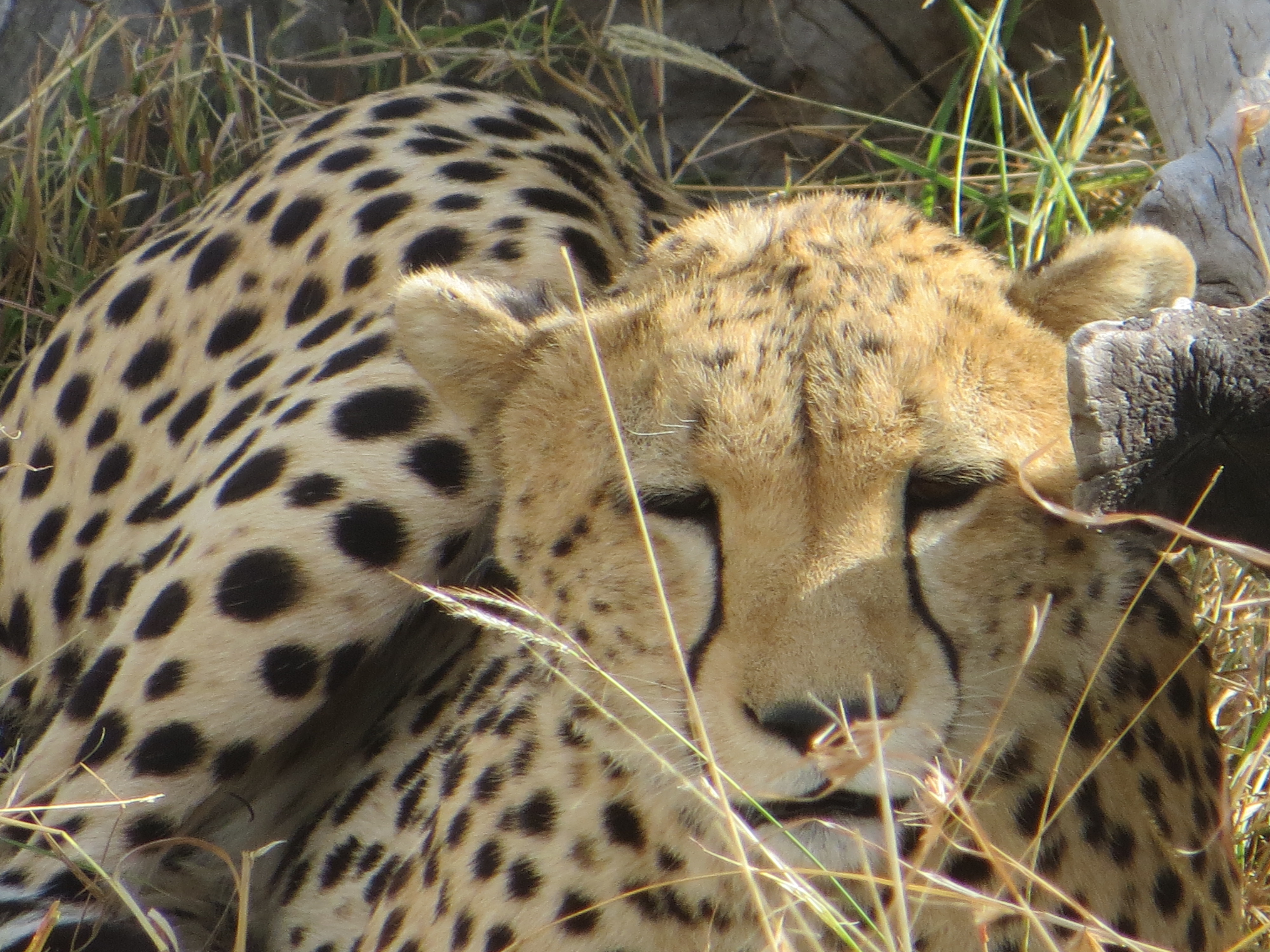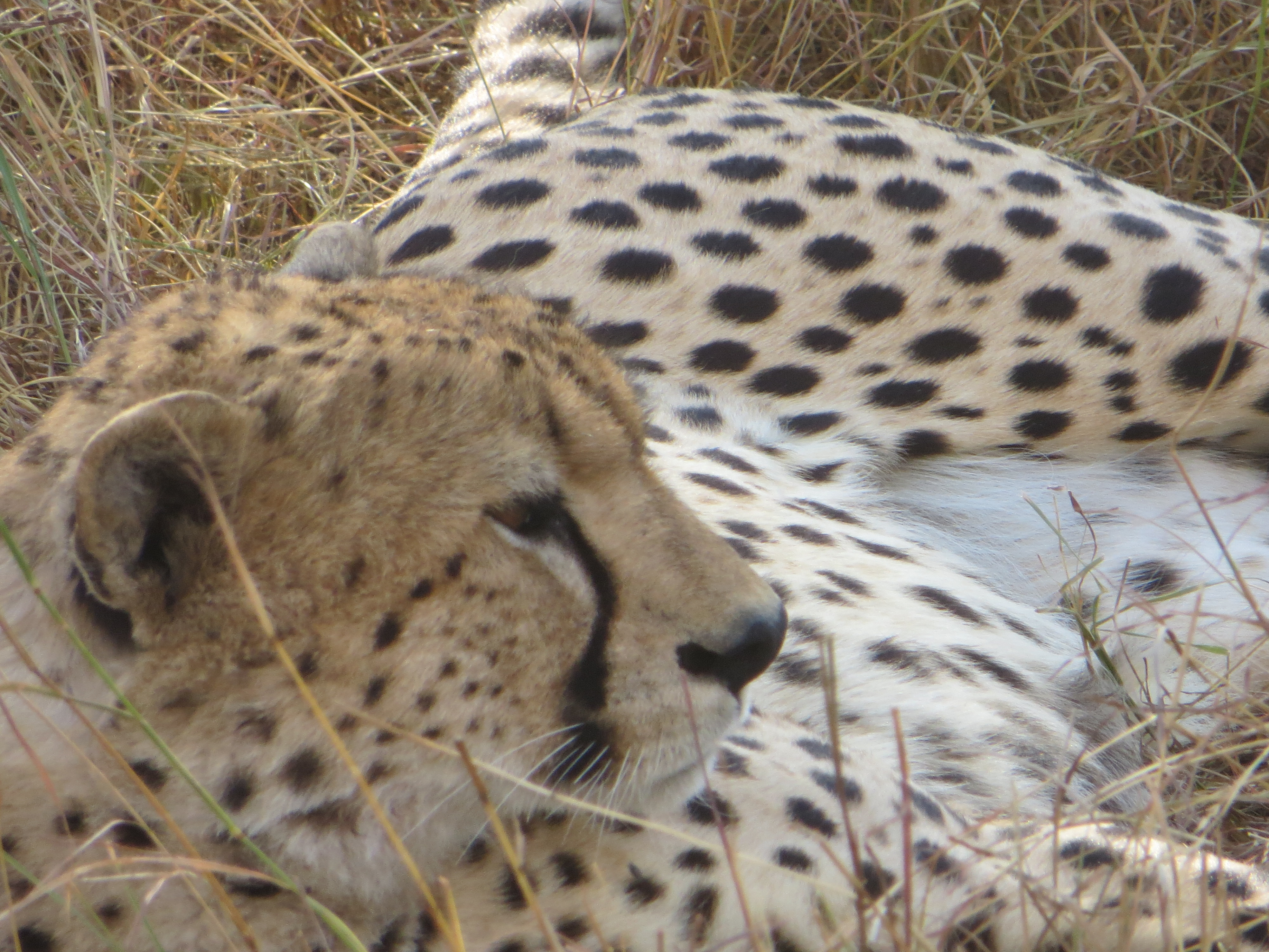 During the ride, Albert told us he would not be taking us to the airstrip because he was scheduled to take the new guests who were arriving today. They were going out in the afternoon with Nathoo. We actually saw them when we spotted a group of cheetahs. Albert radioed Nathoo to tell him about the cheetahs. When Veta saw the two people in the truck with Nathoo, she said to Albert as we drove away, “They look like nice guys.”