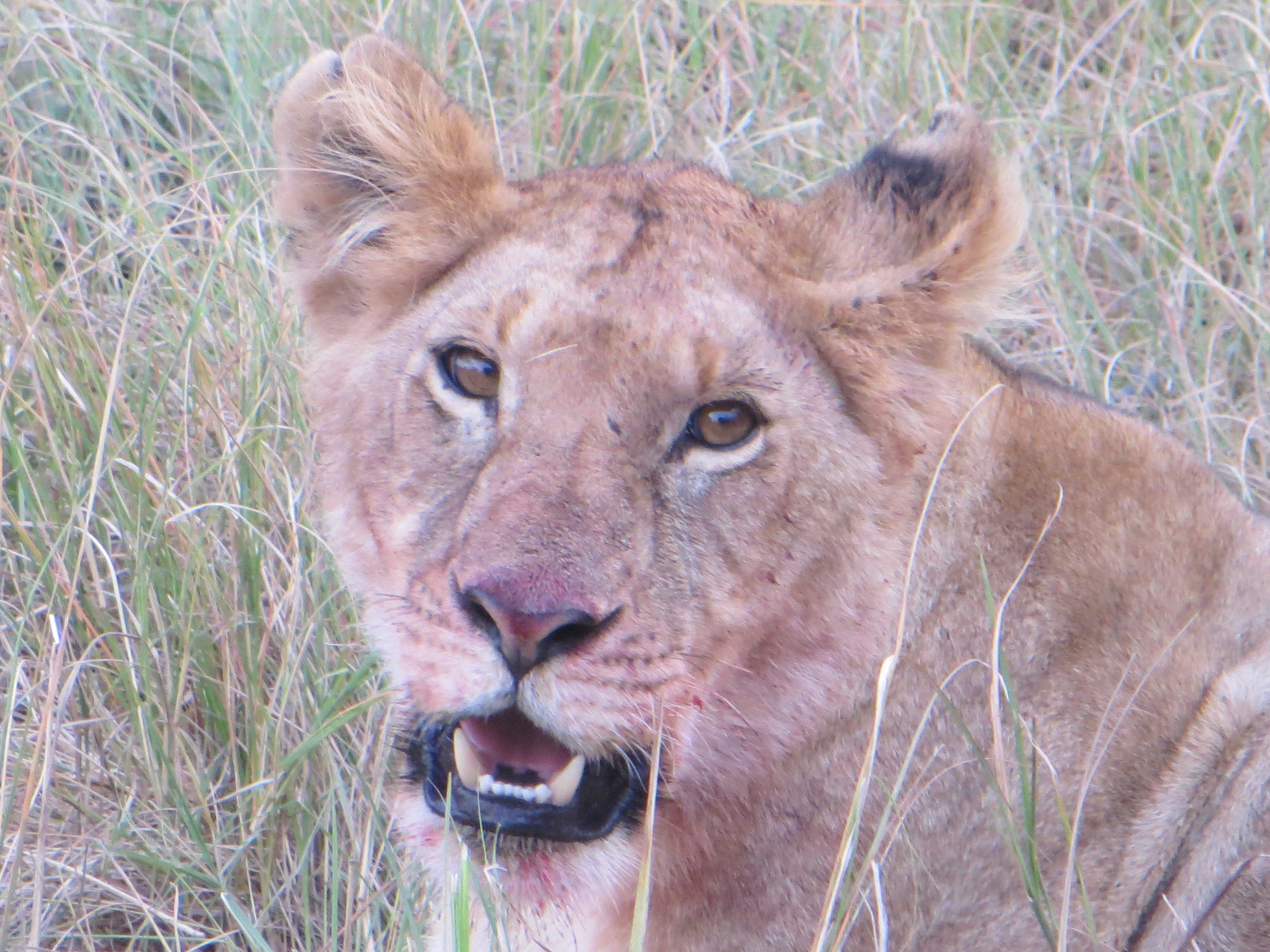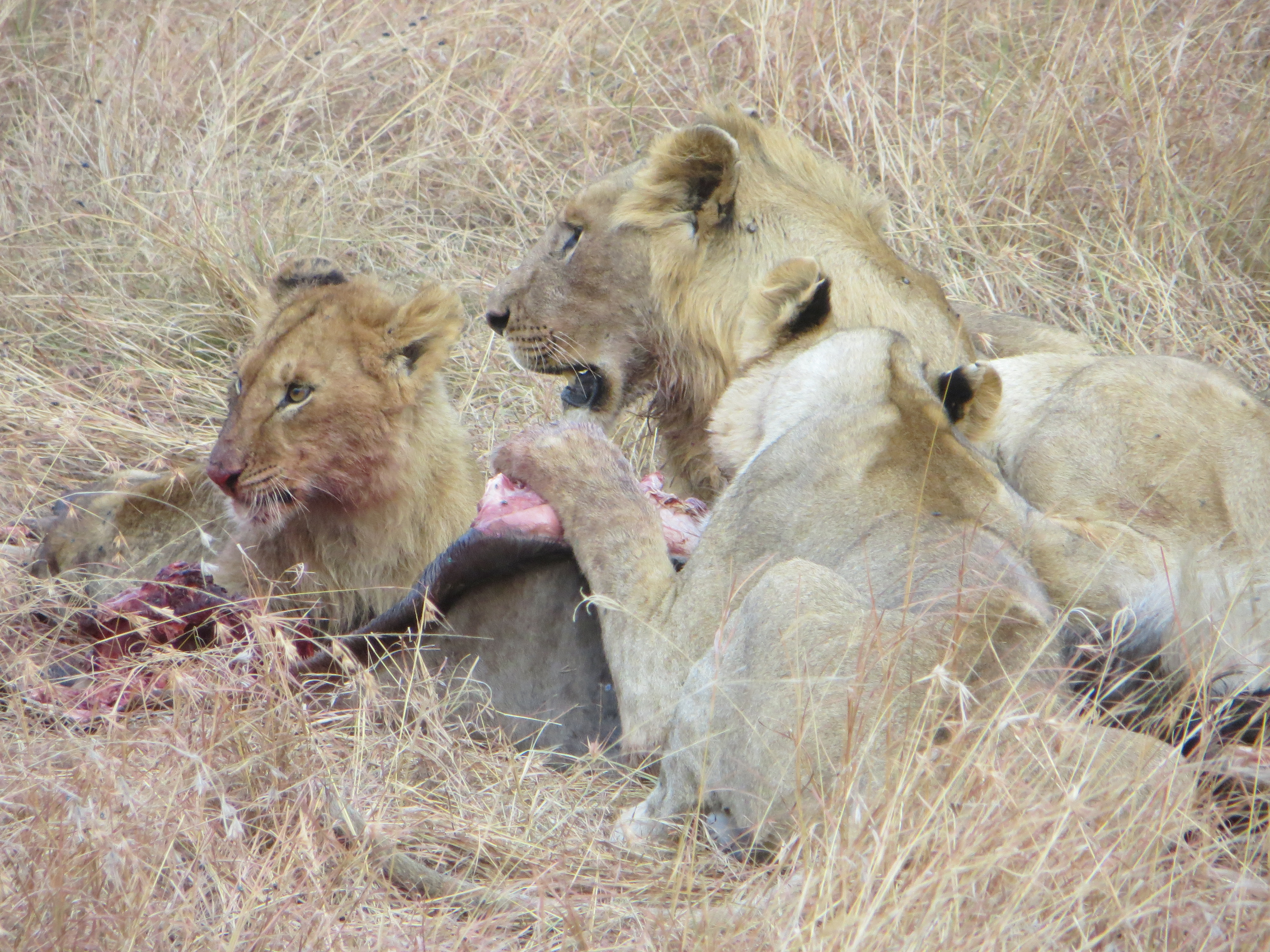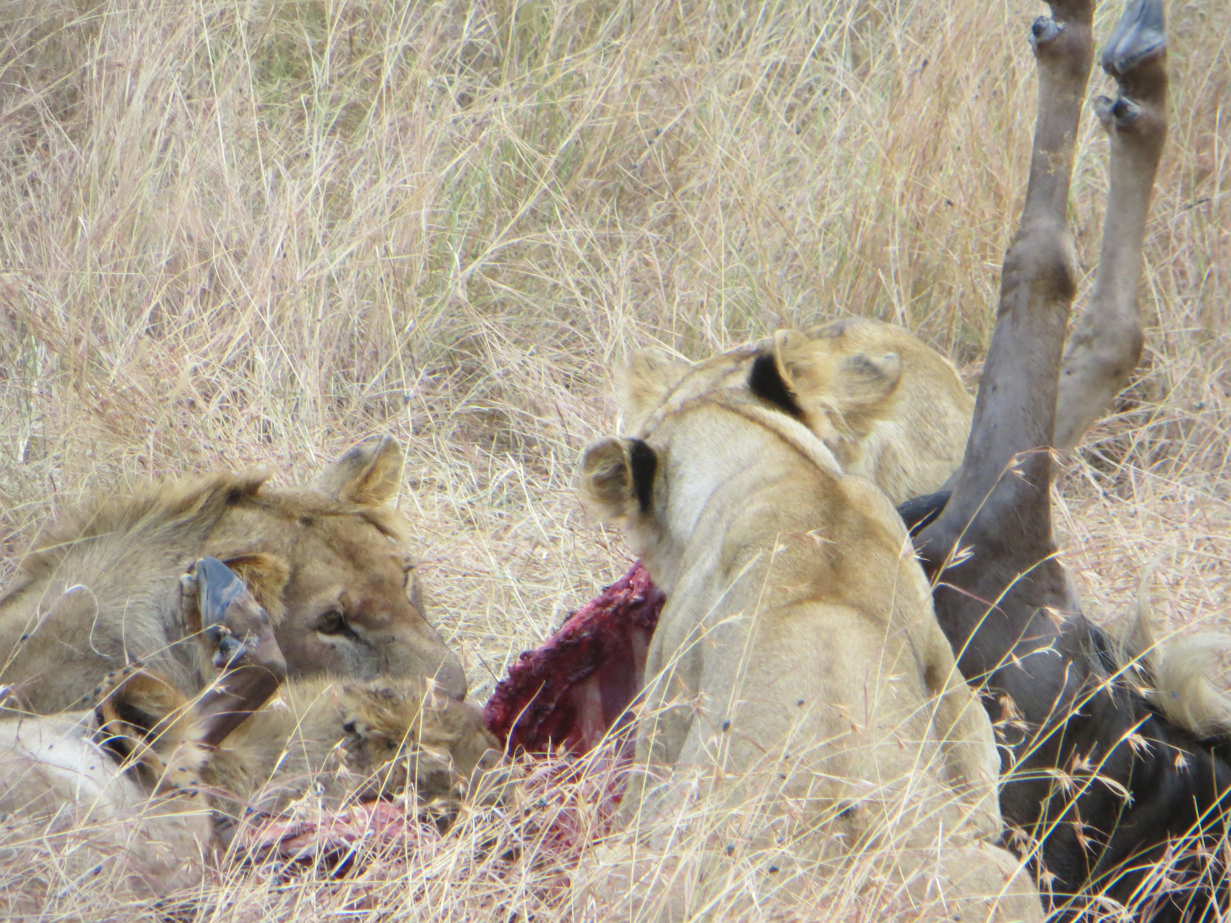 We had a delicious lunch: beet salad, fresh fettuccini with pesto, and a chocolate mousse for dessert. After we ate, we did a bit of shopping at their craft shop and then went on our game drive.  We saw the usual suspects: giant herds of wildebeest (those that had migrated from the Serengeti), giraffes, zebras, warthogs, impalas.  Then we drove a bit more and saw five lions feasting on a wildebeest.  The lions’ faces and paws were smeared with blood and they were just munching and ripping the poor thing to threads.  At one point the wildebeest’s hind legs were up in the air as the lions repositioned the body to tear at its flesh. The largest female who must have eaten her fill was passed out under a nearby tree.  I could just see her big belly rising and falling with breaths of exhaustion.