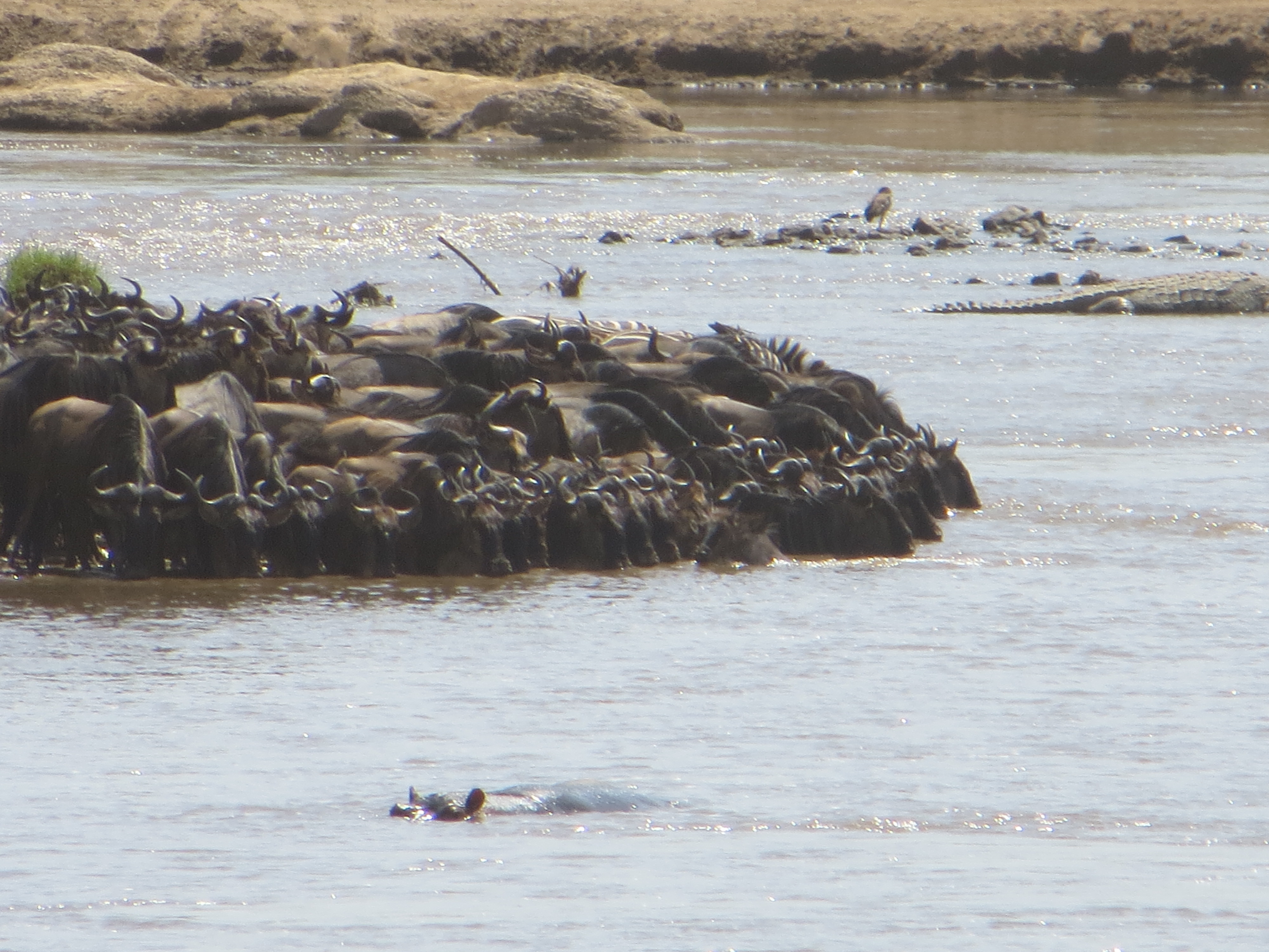 Just when it looked like the crossing was over. The wildebeest that just crossed got confused and ran back to the river to cross back. The funny thing is the entire time there were two crocodiles on the riverbank within snapping distance from the feverish mob, but they were so fat and full they were paralyzed with food and never moved.