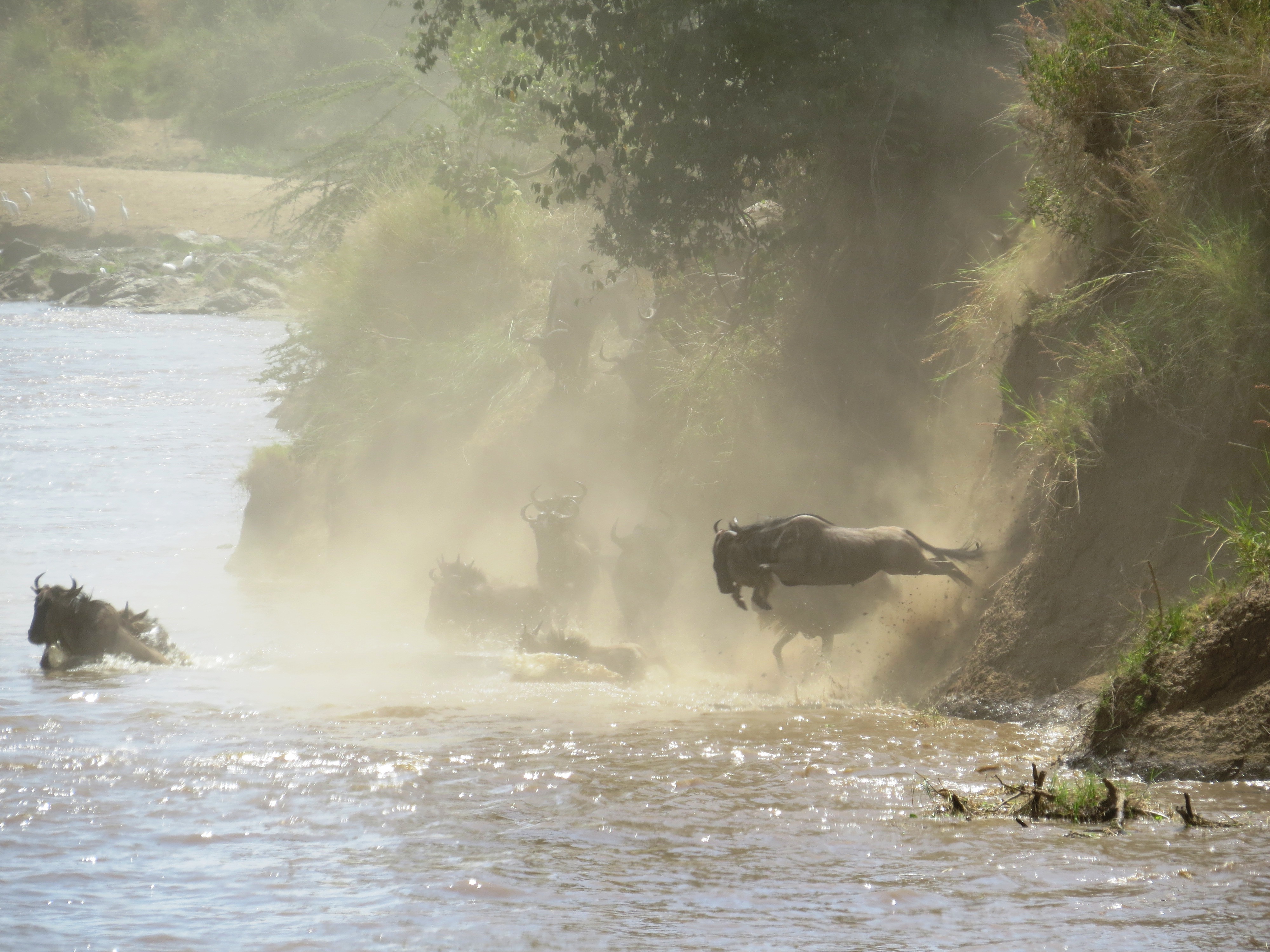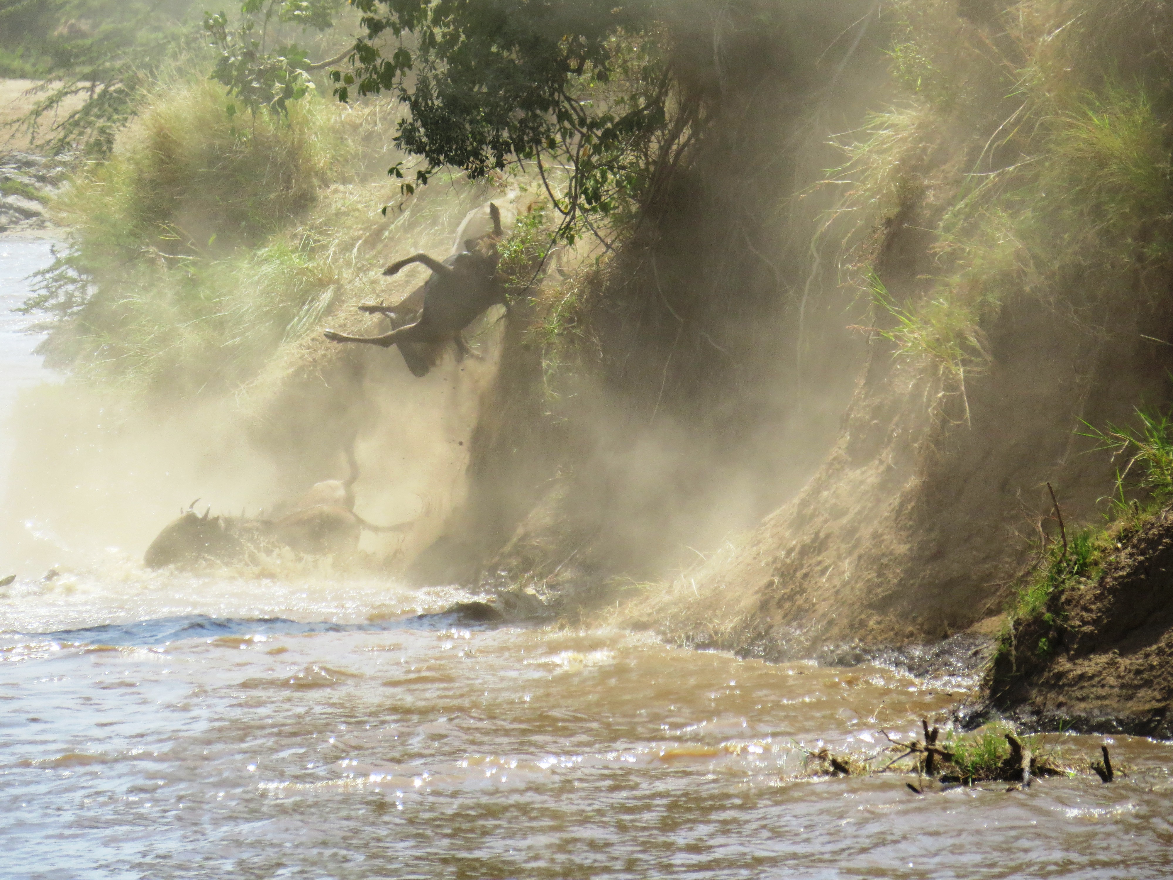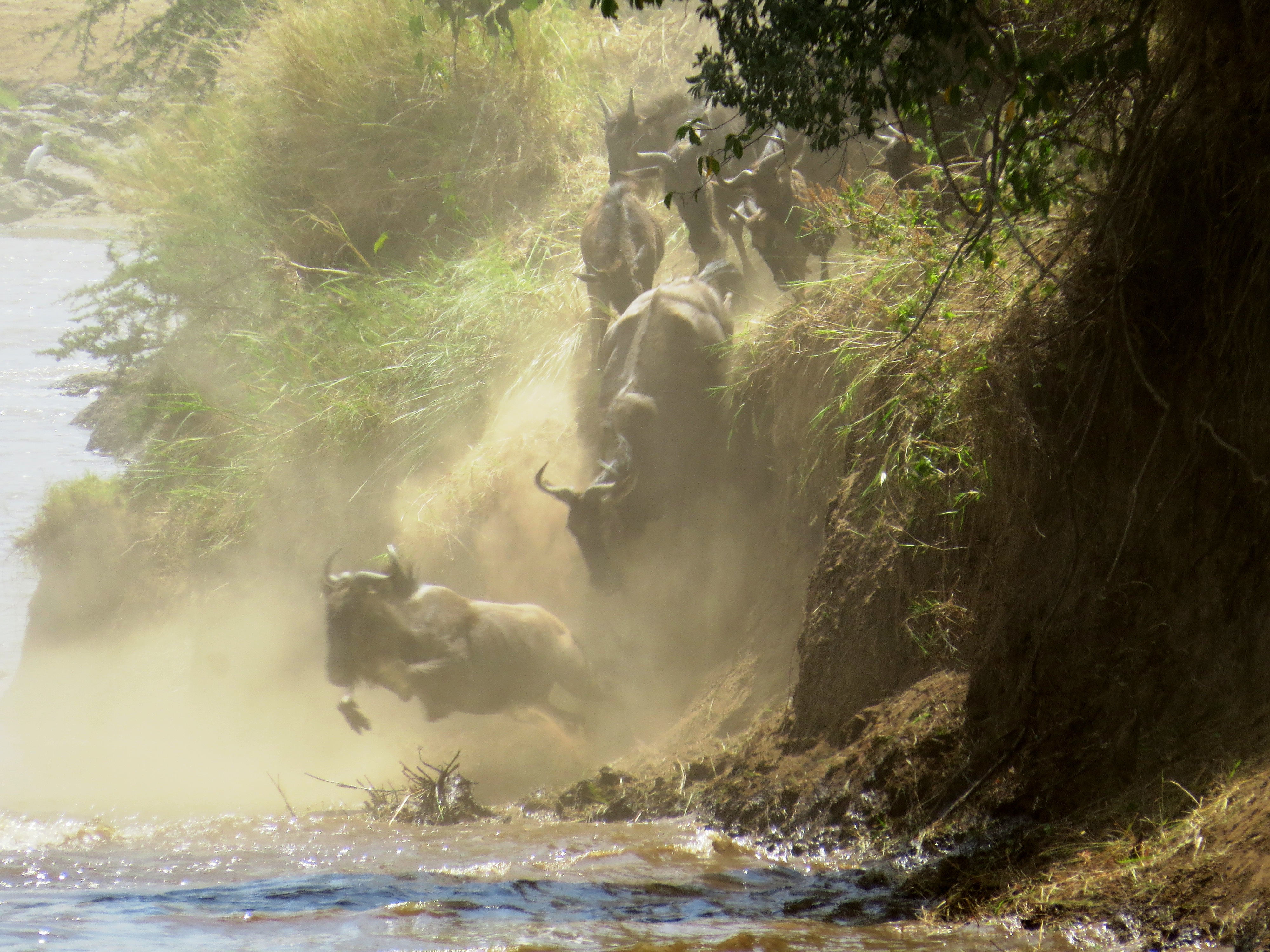 Then all of a sudden a long line of wildebeest appeared behind our cars and started run towards the river. Keep in mind these are the wildebeest that have already crossed. They ran down to the river (first picture) to drink. Some got confused and started crossing the river back to the opposite side. The sight of these wildebeest in the drinking at the river’s edge got the huge heard that had been milling about deciding when to cross went crazy and turned from the safe slope they usually enter the river from, and stampeded to the high embankment across from the drinking wildebeest. The drop was at least 12-15 feet. All of a sudden they started rushing down the steep embankment and into the water. Then some just started jumping and hurling their bodies into the river. It looked like they were committing mass suicide. They landed in the water a started crossing. It was a huge clusterfuck because the jumping ones were landing on the ones already in the water. One jumped and flipped and went crashing into the water on his back. It was such a wild frenzy, we just kept laughing and snapping photos. Benson, then asked me to stand up so he could get a drink out of the cooler. He got his soda and then sat down laughing at the wildebeest.