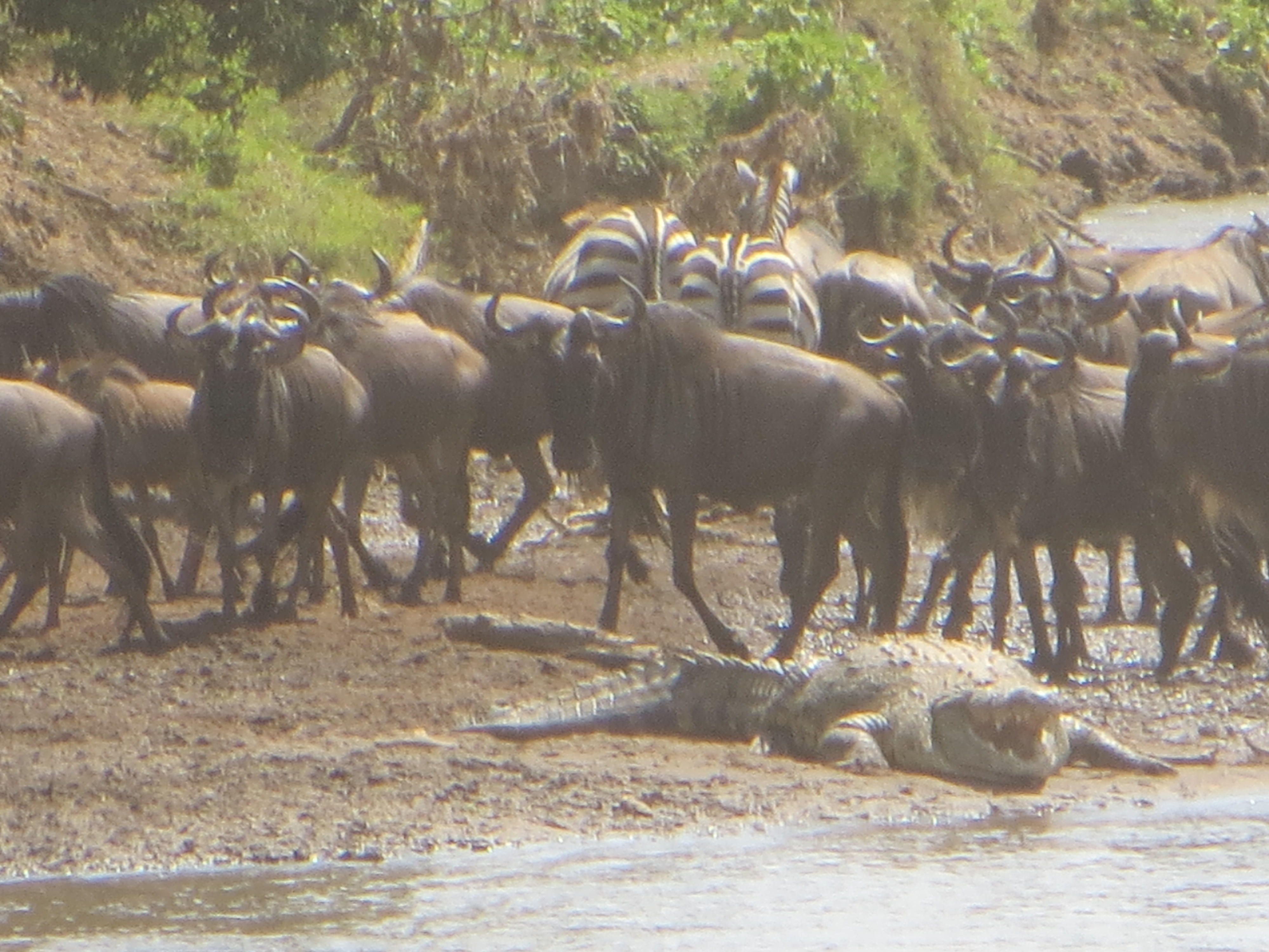 After breakfast, we headed to the river for another crossing. We got a great spot for viewing. This crossing point was the same one we were at yesterday. Veta said she was not so into it because she had just seen a crossing the day before. Benson said no two are alike. While we waited he told us that he did not know when he was born. He had to investigate the year through talking about events that happened around the time he was born. So he discovered the year was 1974 and the date…well he randomly picked up it, June 8th. He did the same for his wife so they now have birth certificates and passports. Benson let me sit in the front of the truck in the passenger seat across from the driver and he hopped in the back. He reclined in the third row waiting for the show. Again he imitated the wildebeest challenging the lion and we all laughed.