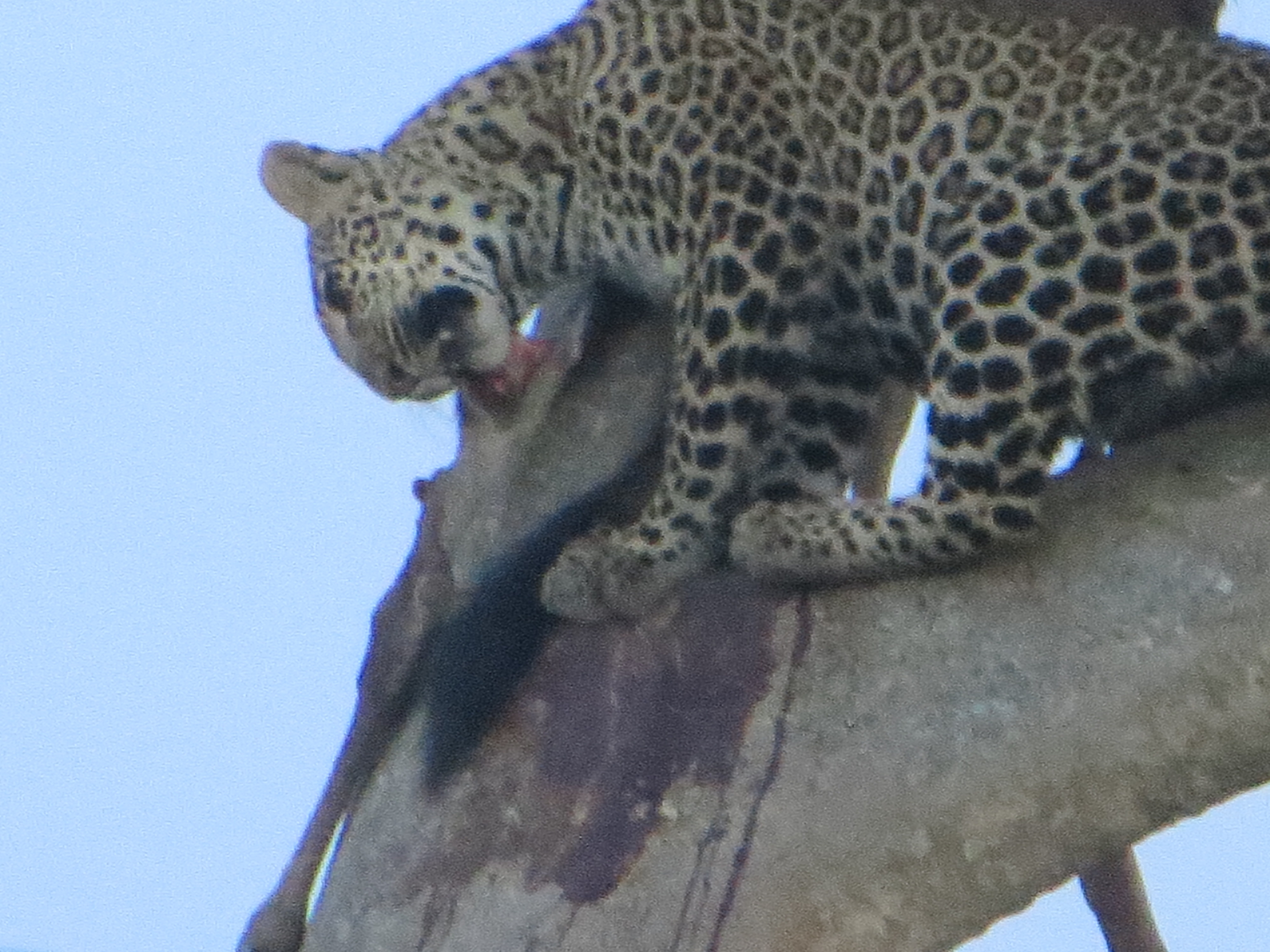 2 thoughts on “Wildebeest Jumping, Lions Humping, and a Leopard Dining on his Kill in a Tree