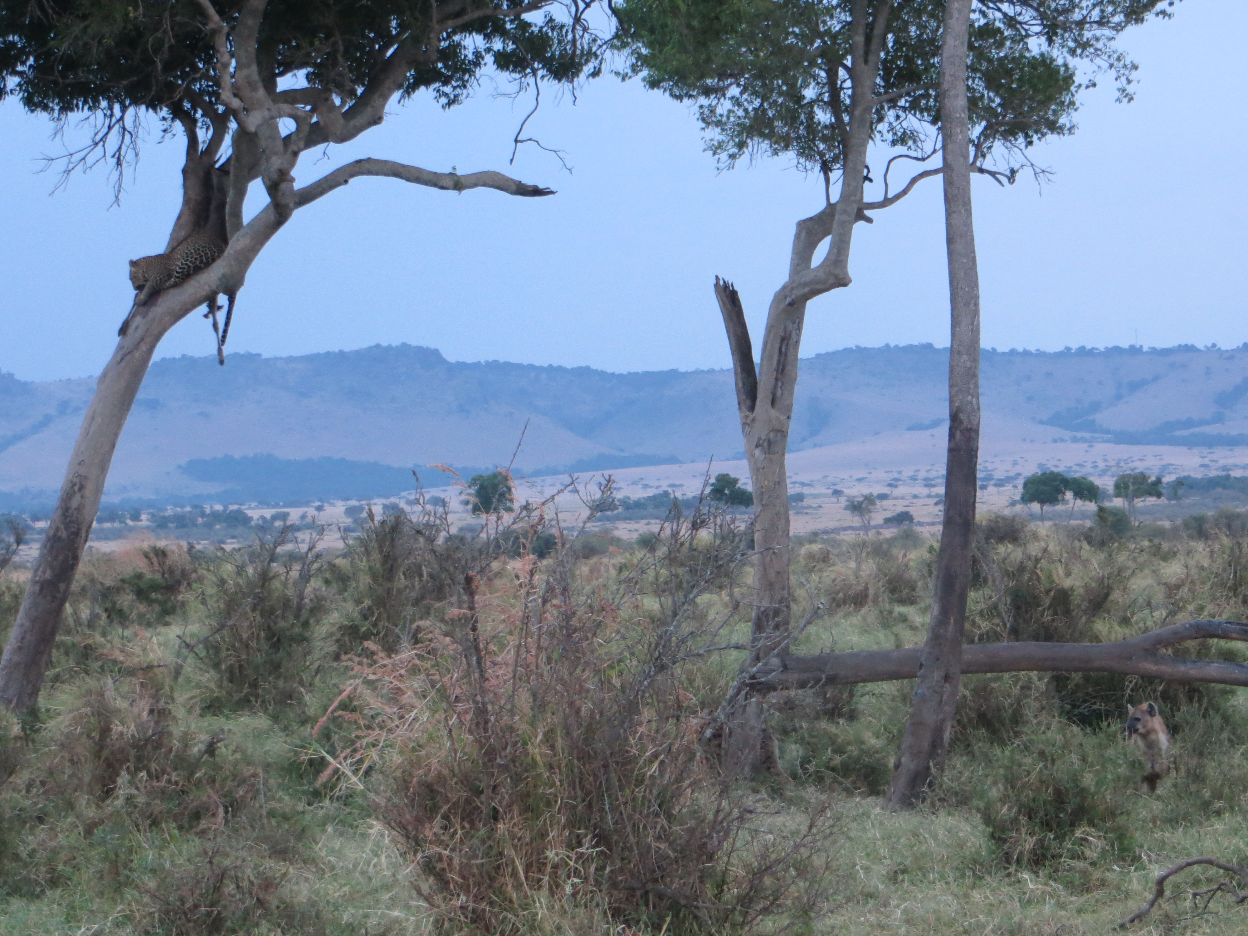 After lunch, I got ready for the 4pm afternoon ride and Veta went to the spa and skipped the game drive. Too bad for her because it was amazing. I was back in my regular car with Lynn and Steve and Duncan. We entered the park and saw the usual suspects, but we were on a mission to see the leopard and Lynn still had not seen any baby elephants. About an hour into the drive it started raining hard. Duncan passes out rain ponchos and we continued to drive. Duncan spotted a group of elephants in the distance so we started driving towards them, but we got distracted by two mating lions. We sat with them for a while clicking our porn shots and then moved on. We got a quick glimpse of the baby before the family of elephants went into the forest and we were unable to see them because of the trees and bushes. We kept driving in search of the leopard. Then another family of elephants appeared with a tiny baby. So we stopped to take pictures. It was almost 6pm. We have to be out by 6:30, but Duncan wanted to check one more tree. As we drove up, there was the leopard and he was eating a wildebeest in the tree. Down below were two hyenas waiting for any body part that dropped from the leopard’s feast (check the wide shot of the leopard in the tree, the hyena is visible in the lower right). By this time it was 6:30, so Duncan drove fast to get us outside. He took a shortcut to a side gate so he would not have to face ranger wrath at the main gate for being late. We reached the side gate by 6:40…not too bad.