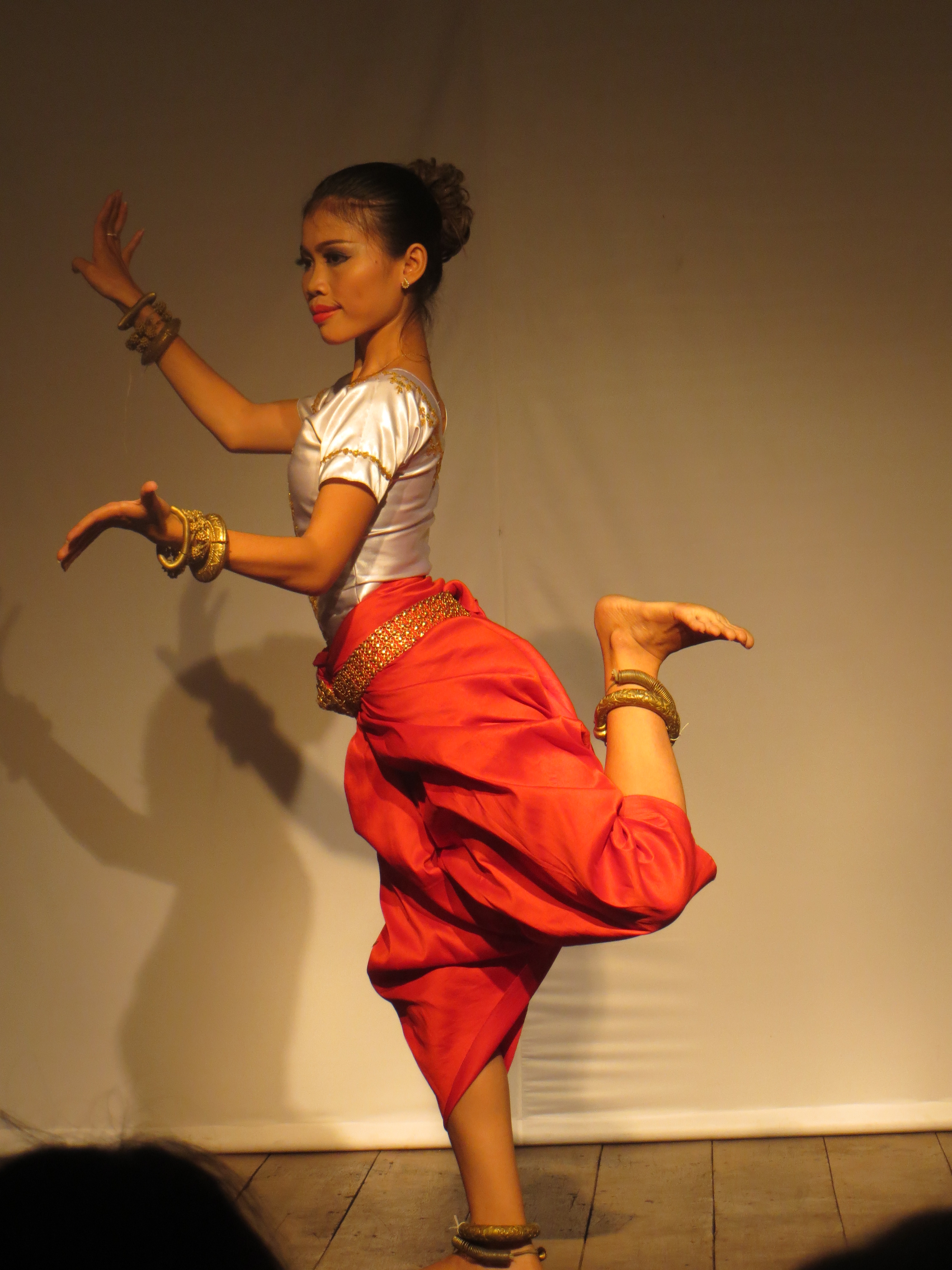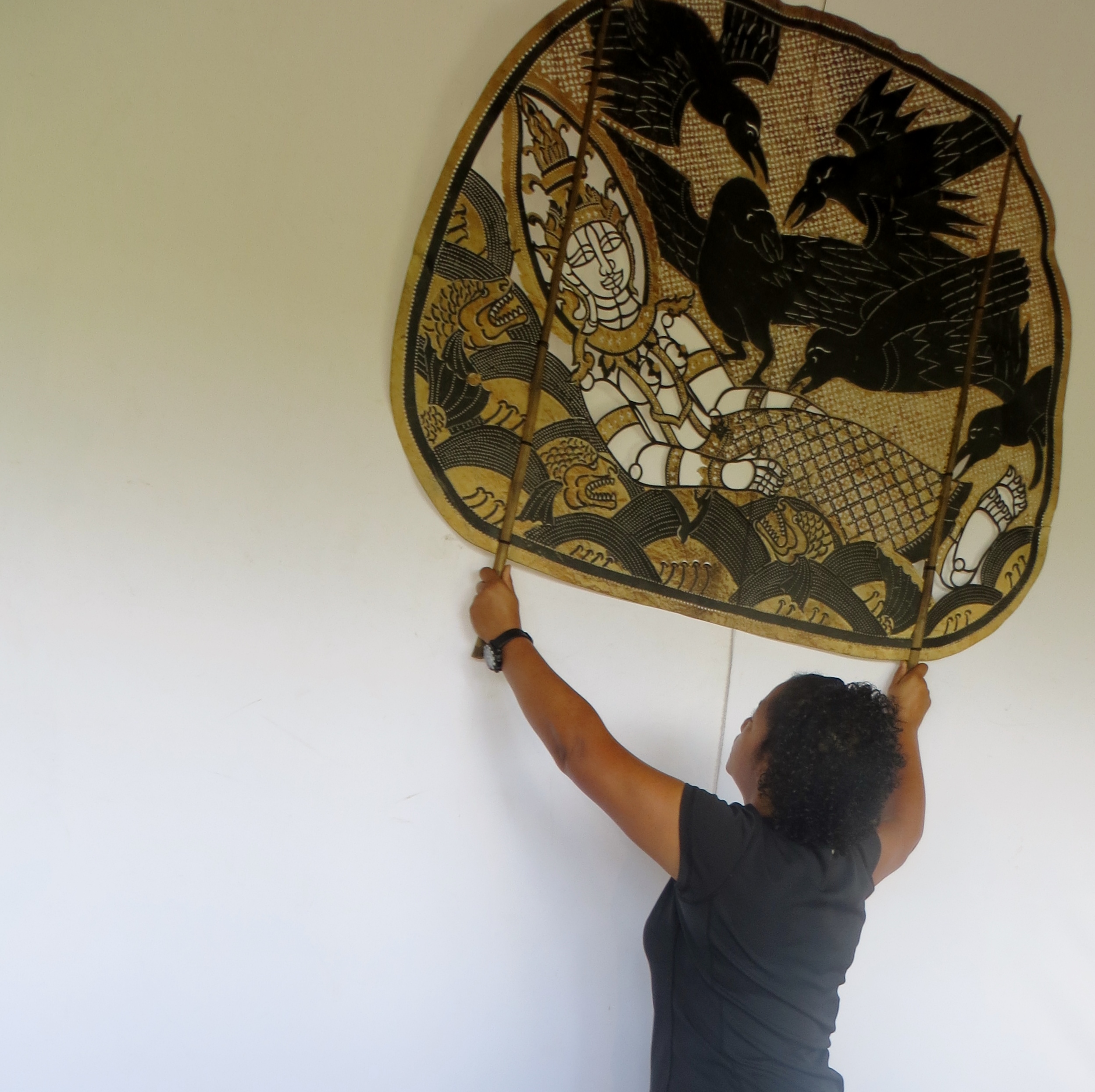 I spent my second day learning a bit about shadow puppets and mask making at the Sovanna Phum Art Association. There is a company called Backstreet Academy that books interesting activities that support local artists. I tried my hand at shadow puppetry. My able teacher taught me the proper dance moves. It is really hard because the shadow puppets are like large 3-foot leather fans attached to bamboo sticks. They weigh about 10-15 lbs. You have to hold them above your head and move them to the music while gracefully dancing about the stage and balancing on one leg to symbolize flying. It was hot as hell in the outdoor theatre with the sun beating down on us and the hot lights beaming on us from behind to cast the shadow on the screen. With each blistering step my “grace” became less and less. Finally, my teacher gave me a water break. I bought a really cool miniature drum with a long metal spring attached. It can make the sound of thunder, wind, and rain. Then it was back to the puppets. We completed my mini show and then he showed me other types of puppets. It was a really fun but sweaty afternoon.