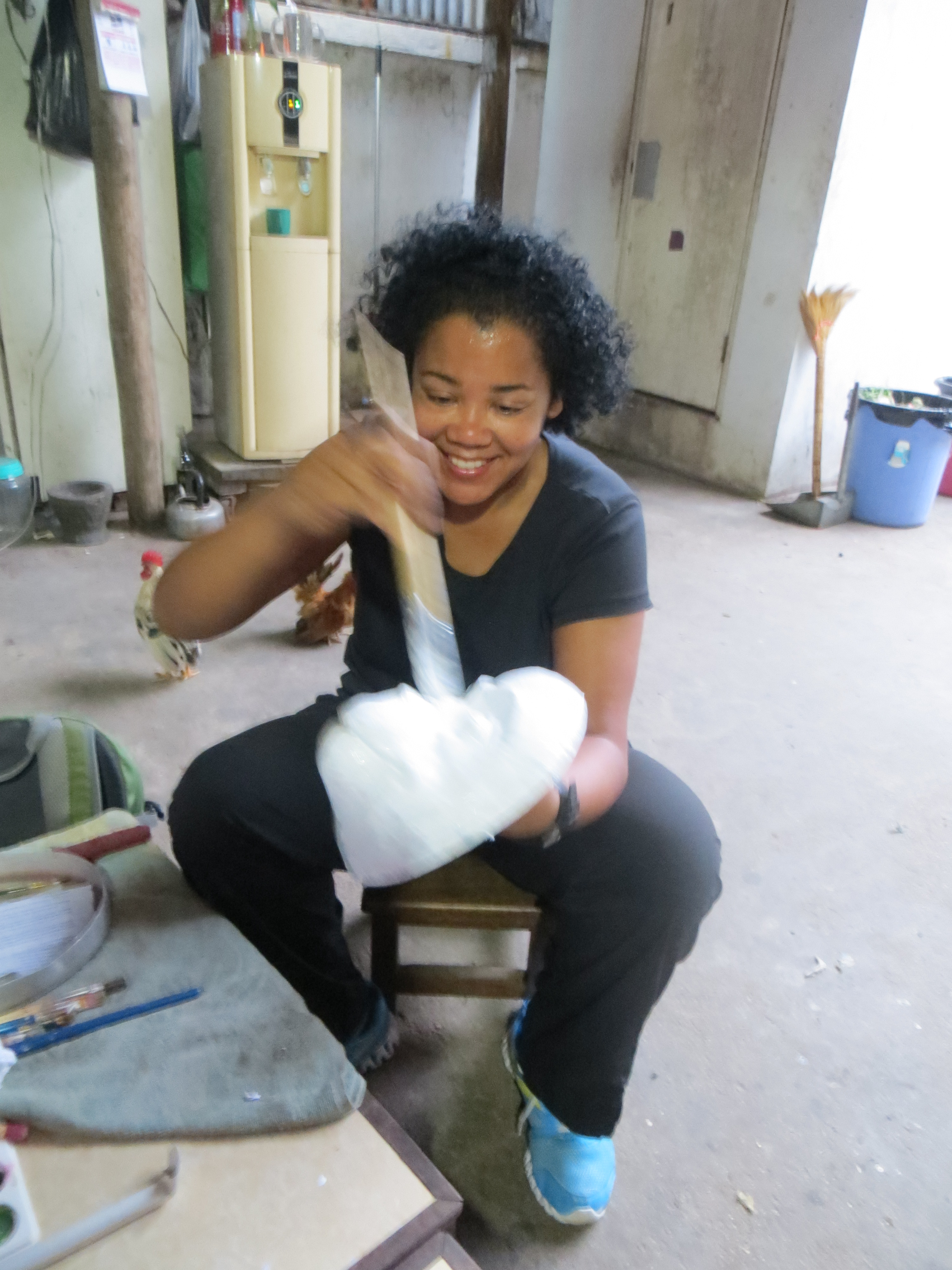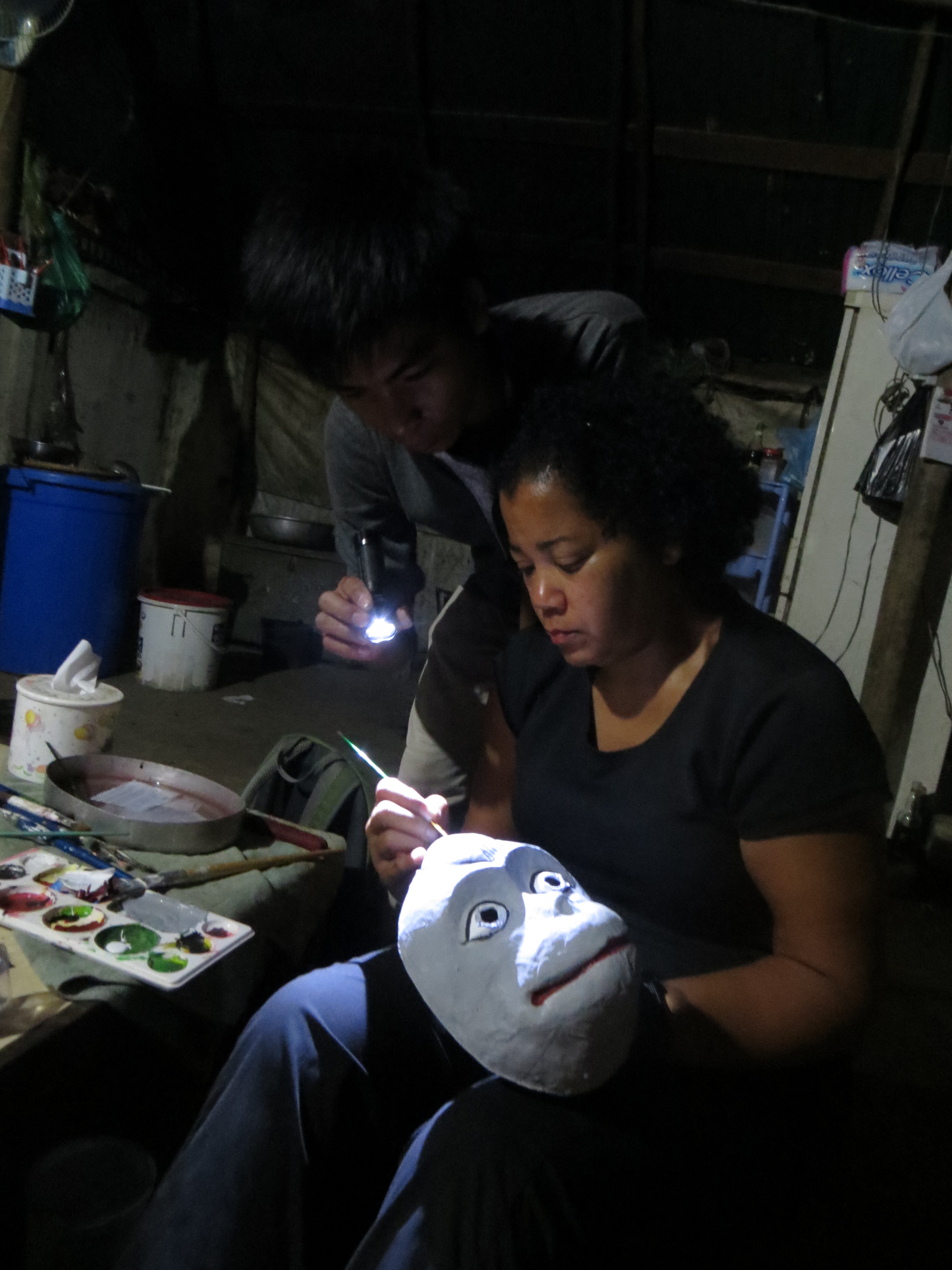 After my lunch break, I returned for the mask making class. I was shown how to make a paper mask of a monkey. They use a concrete mold that they layer with strips of crumpled/softened paper that is held together with tapioca flour glue – sort of like making a mask with paper mache. After we dried it with a hair dryer, he showed me how to paint it. It was very fun. During my mask-making class a young ex-pat reporter for a local paper came by taking photos for an article for the weekend section of the paper. Not sure if my sweaty face will make the cut – probably a blessing if it does not because I do not know if I will be good advertisement.