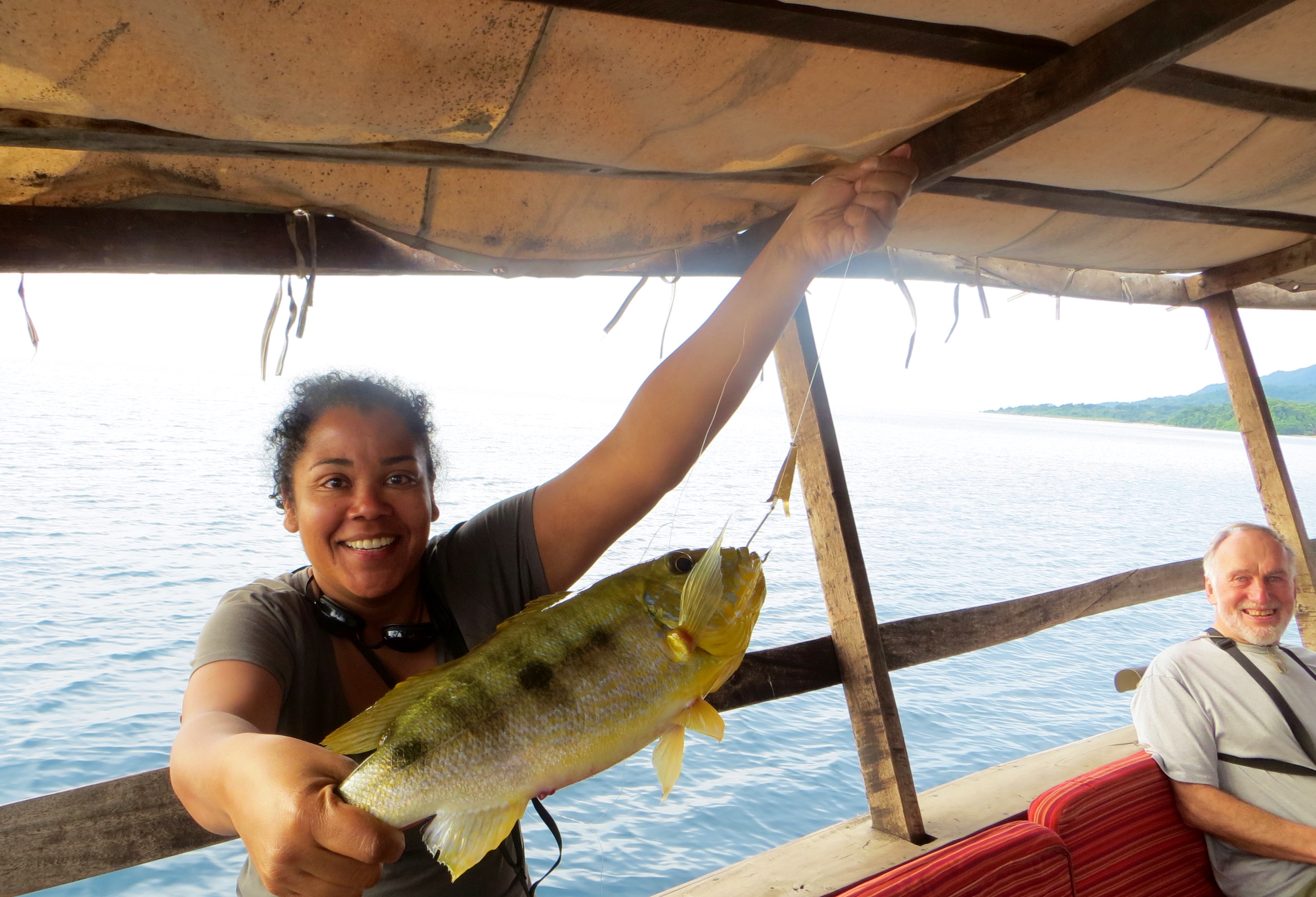 When we took off in the boat, we were about 30 meters from shore when Big Bird landed on the roof of the boat with a loud, ungraceful thud. He likes to hitch a ride and try to steal any fish we catch. When we got to the deep part for swimming a few of us jumped in. The water temperature was in the 80s. From the storm and the wind, the water had a strong under current although it looked calm on top. We all were getting pulled pretty far from the boat. Thank goodness there was a tow line we could use to help pull ourselves back. I thought I was a pretty good swimmer, but that’s doing laps in a pool, this current was a different story.